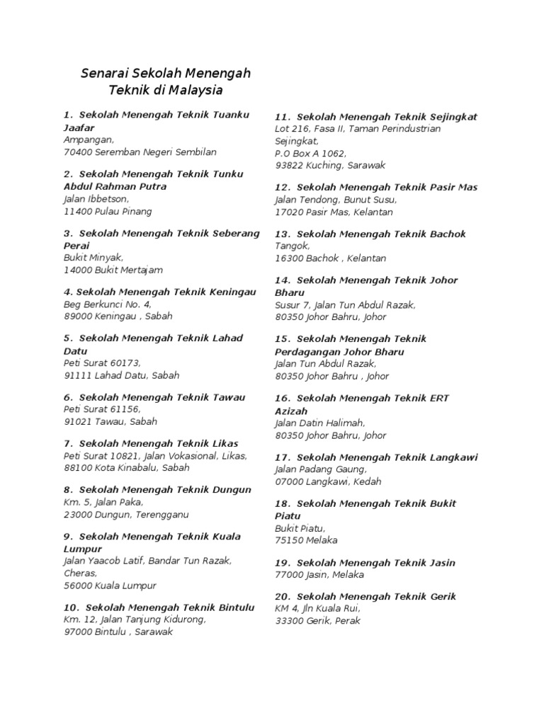 Sekolah menengah negeri selangor bil negeri ppd jenis sekolah kod sekolah nama sekolah alamat daerah poskod no telefon no. Seterusnya mari lihat senarai kolej vokasional yang terdapat di malaysia. For faster navigation, this iframe is preloading the wikiwand page for sekolah menengah sains johor. Sekolah menengah teknik atau ringkasnya smt merupakan sekolah menengah atas iaitu tingkatan 4 dan tingkatan 5 yang memberi peluang kepada murid yang senarai kursus ditawarkan smt. Berikut dikongsikan senarai 68 buah sekolah berasrama penuh dan ranking sbp terbaik di malaysia.