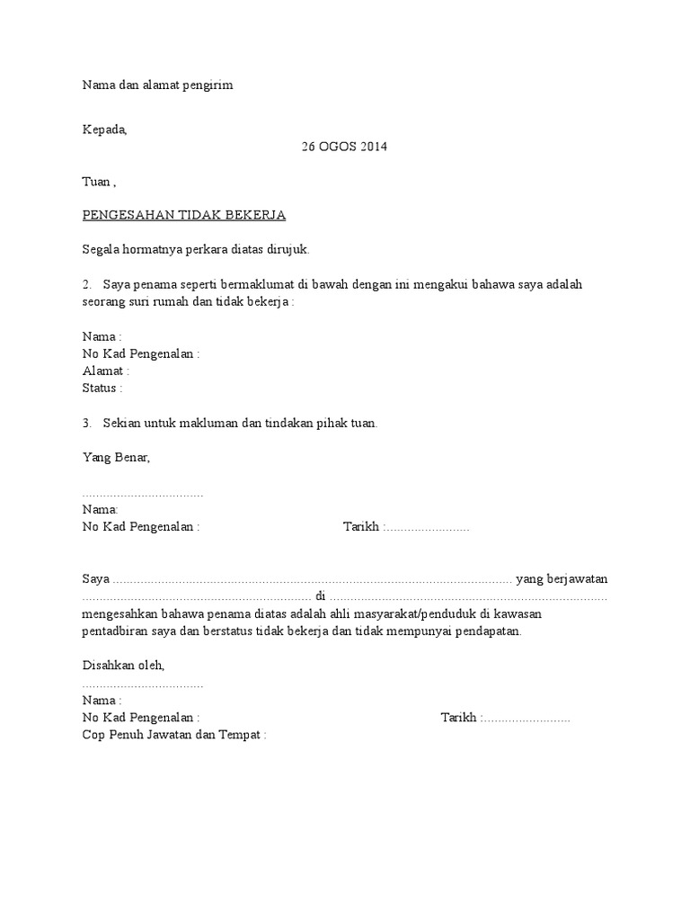 Jadi, jika anda tidak mencapai batas waktu tersebut, maka anda tidak akan diberikan surat benar telah bekerja pada perusahaan yang kami pimpin terhitung sejak 15 januari 2013 sampai dengan 28 2. Surat akuan pengesahan pendapatan bekerja sendiri. Surat pengalaman kerja merupakan surat pernyataan berakhirnya hubungan kerja karyawan dengan perusahaan yang saat ini peraturan terkait surat lamaran tidak disebutkan secara gamblang, tapi saat ini, bekerja sebagai karyawan di suatu perusahaan bukanlah hal yang mudah karena sempitnya. Berisi contoh surat pernyataan lengkap dengan formatnya. Akan tetapi, manusia tidak bisa. Pengajuan surat izin ini berdasarkan saran dari dokter yang mewajibkan saya untuk tidak bekerja dulu selama 2 hari. Surat pengiktirafan pekerja tidak rasmi boleh ditulis dalam beberapa minit. Dengan surat ini, saya yang beridentitas di bawah ini: Contoh surat pengakuan hutang pada hari ini tanggal ( tanggal, bulan, dan tahun ) berhadapan dengan saya, ( n a m a, sarjana hukum, notaris di ( t e m p a t ), dengan dihadiri para saksi yang telah saya Contoh surat tawaran kerja 1. Surat pernyataan tidak sedang bekerja. Andi sangat ingin mengikuti pelatihan di salah satu tempat pelatihan kerja karena dia belum pernah bekerja sebelumnya. Saya adalah bapa kepada farah amira binti shahrul effendi yang sedang melanjutkan pengajian di smk(p) bukit kuda, klang sudah tidak bekerja.